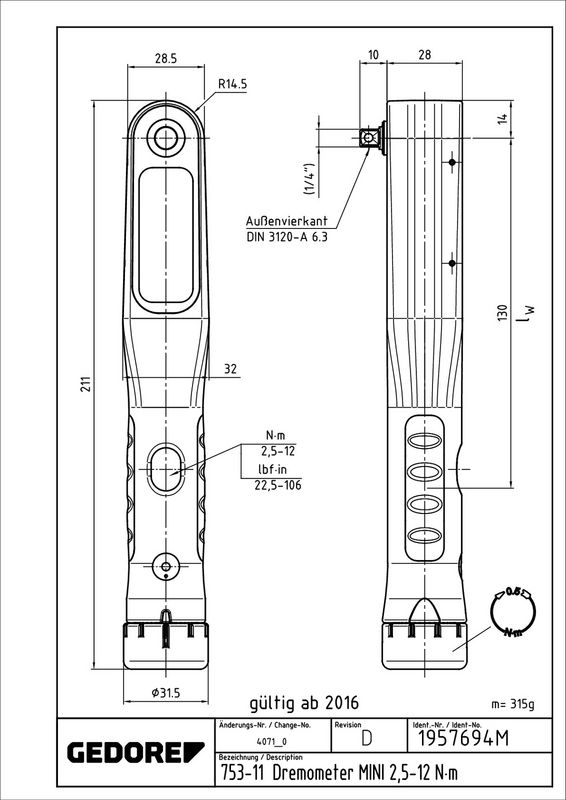 Einsatz: Kontrollierter Schraubenanzug im Bereich von 2,5 - 12 Nm / 22,5 - 106 lbf·in Einsatz in fast allen industriellen Fertigungsbereichen Ausführung: Klassifiziert nach DIN EN ISO 6789-2:2017 Typ II Klasse A, inkl. rückführbaren Prüfzertifikat, Kalibriert auf eine maximal zulassige Abweichung von +/- 3 % und somit präziser, als die in der Norm geforderten +/- 4 % Drehmomentschlüssel mit 1/4" Antriebsvierkant mit Kugelsicherung DIN 3120 - A 6,3 ähnlich ISO 1174, für den kontrollierten Rechtsanzug Automatische Kurzwegauslösung mit fühl- und hörbarem Signal Leichtes Kunststoffgehäuse aus hochwertigem, glasfaserverstärktem Hightech-Polyamid mit Weichkomponente im Griffbereich Doppel-Skala mit einer Skalenteilung von 0,5 Nm und 5 lbf·in Zusätzliche Mikrometerskala zur Einstellung von Skalenzwischenwerten, mit Nm-Teilung von 0,05 Nm Sichtfenster mit Lupeneffekt Sichere Arretierung des eingestellten Drehmomentes durch einrastenden Verstellknopf Lieferumfang: Drehmomentschlüssel Typ MINI Mit Prüfzertifikat nach DIN EN ISO 6789:2017 Typ II , rückführbar über firmeneigenes DAkkS-Labor auf das Nationale Normal