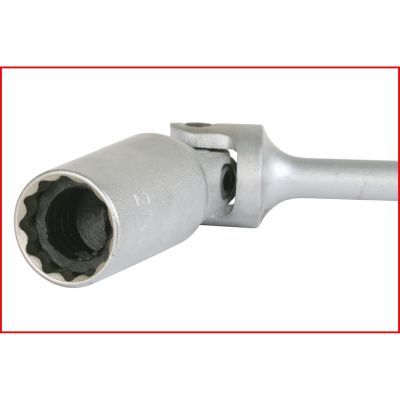 •12-kant•Doppelsechskantprofil ermöglicht Aufnahme von Sechskant-und Zwölfkant-Zündkerzen•für schwer zugängliche Bereiche•universal einsetzbar•mit Gelenk•mit Haltegummi zum Halten der Zündkerzen•matt satiniert•Chrom Vanadium
