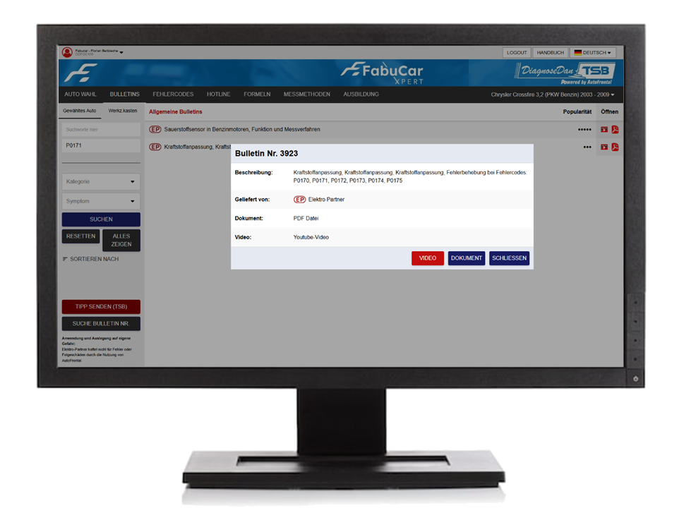 Mit FabuCar Xpert auf dem FabuCar DOC PRO stehen alle Diagnoseinformationen direkt im Workflow zur Verfügung. Fehlercodes, Live-Daten und die passenden DDTSB-Service Bulletins werden fahrzeugspezifisch angezeigt – inklusive Fehlerbildern, Ursachenanalysen und Reparaturempfehlungen.